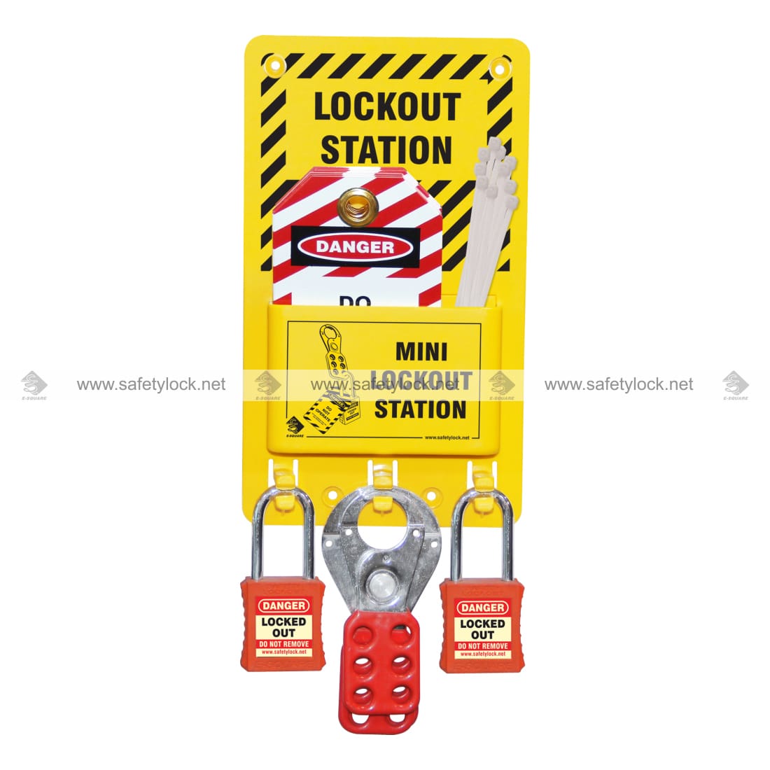 - Open Lockout Stations – Side View for 5 Locks with Goods are designed to hold lockout padlocks, tags, and hasps near the isolating points.